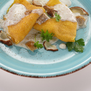 Piccole crepes all'uovo che racchiudono un ricco ripieno di funghi e soffice formaggio. La semplicità in questo piatto è sinonimo di qualità e gusto che certo non passano inosservati.